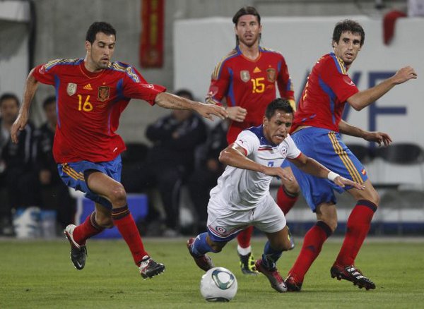 Con las bajas de Piqué y Puyol, Del Bosque ensayó con una defensa de circunstancias, con Javi Martínez y Albiol como centrales, y como dice el refrán, una y no más Santo Tomás. La falta de coordinación propició que Isla rompiera el fuera de juego por la derecha y lograra el primer tanto, con un fantástico disparo a la escuadra. La lentitud de los centrales españoles, propició que Vargas se fuera en velocidad y lograra el segundo driblando a Casillas.