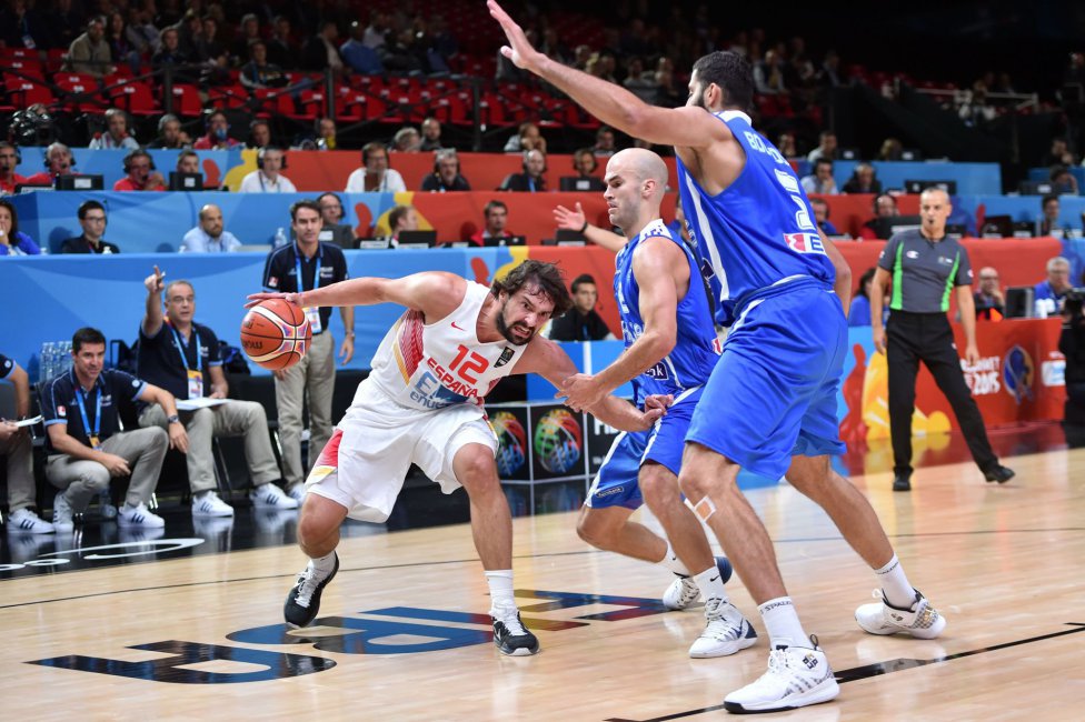 Pau Gasol por sus molestias en el gemelo, Rudy Fernández por sus problemas de espalda y Pau Ribas por sus anginas habían sido motivo de preocupación en los últimos días pero los tres estuvieron en el quinteto titular junto con Mirotic y Llull. El base del Real Madrid salió inspirado y con dos triples consecutivos puso el 6-0 en el marcador. Gasol intimidó en defensa en los primeros minutos con dos tapones con una Grecia que quería buscar el poste bajo con Giannis Antetokounmpo y sus 2,11 m. El griego estaba emparejado con Rudy al que superaba en altura y fue el autor de la primera canasta de su equipo. Lamentablemente Rudy sigue sin estar al 100% y casi no pudo ayudar al equipo.