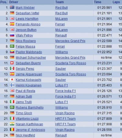 A falta de los 10 últimos minutos ya estaba más que claro que los Red Bull eran los únicos que podían luchar entre sí por la pole. En las primeras cuatro carreras de la temporada, Vettel había conseguido el primer puesto pero esta vez Mark Webber fue capaz de arrebatarle ese honor. Los pilotos de la escudería austriaca tenían opción de hacer otro intento pero decidieron no pelear entre ellos y guardarse los neumáticos.