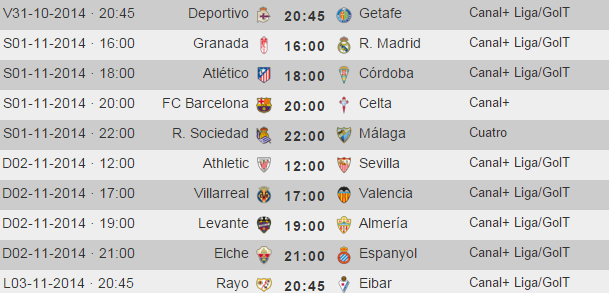 Deportivo y Getafe abren la jornada el viernes mientras que el sábado entran en juego tres de los equipos de Champions. El Real Madrid visita Granada a las 16:00, el Atlético recibe al Córdoba a las 18:00 y el Barça al Celta a las 20:00 en el partido de Canal +. El partido en abierto de esta semana es el que enfrenta a Real Sociedad y Málaga. Otros duelos interesantes son el Athletic-Sevilla del domingo a las 12:00 o el derby entre Villarreal y Valencia que se juega el domingo.