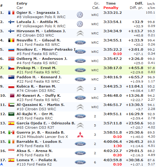 En el bucle vespertino Dani Sordo perdía todas sus opciones porque tocaba una piedra y dañaba una rueda y la suspensión de su Citröen así que tenía que abandonar. La batalla se quedaba entre los dos pilotos de Volkswagen pero Ogier no daba opción a Latvala porque ganaba los tres tramos de la tarde y, sobre todo en Terra Alta, volvía a dar una exhibición sacando 30 segundos de ventaja sobre su principal rival.